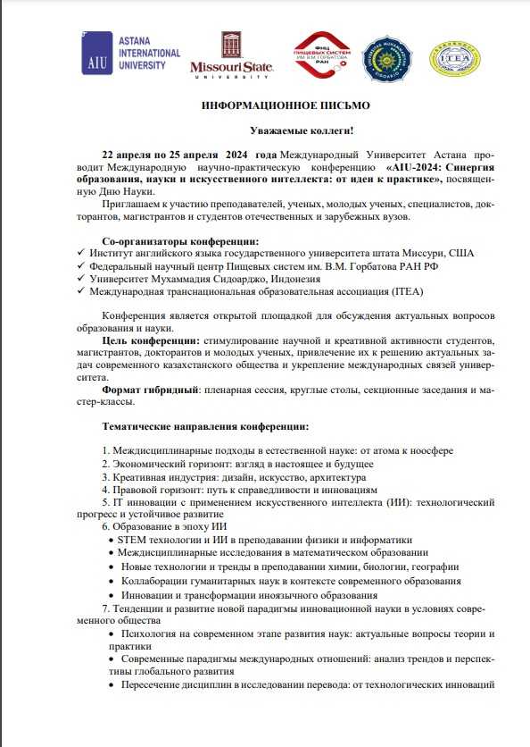 22 апреля по 25 апреля 2024 года Международный Университет Астана проводит Международную научно-практическую конференцию «AIU-2024: Синергия образования, науки и искусственного интеллекта: от идеи к практике», посвященную Дню Науки. Приглашаем к участию преподавателей, ученых, молодых ученых, специалистов, докторантов, магистрантов и студентов отечественных и зарубежных вузов.